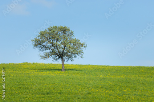 Obraz premium A bright green summer meadow with no people around. An alone tree on the field