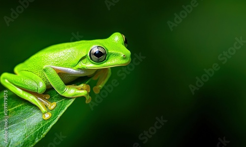 Naklejka premium A bright green tree frog rests elegantly on a leaf, its vibrant color...