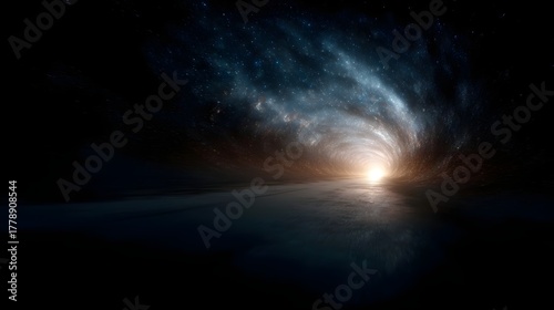 Fototapeta premium A bright light emanates from the end of a swirling cosmic tunnel with stars and cosmic dust creating a dramatic vortex