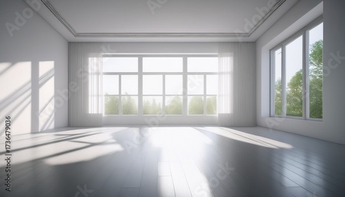 Obraz premium a bright minimalist room with large windows casting soft shadows on white walls and floor