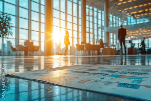 © Theraphol, Obraz premium A bright, modern lobby with large windows, showing people and a document on the floor, illuminated by warm sunlight.