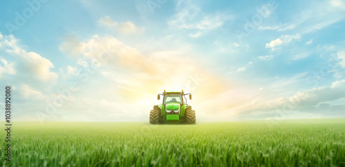 Fototapeta premium A bright morning dawns over a green field with a tractor in the distance...