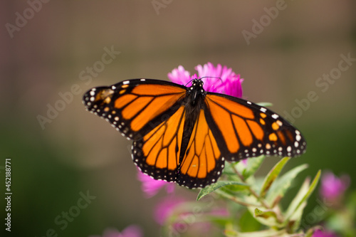 © Jaden, Fototapeta premium A bright orange butterfly lands on pink and orange flowers with its wings spread
