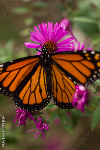 © Jaden, Fototapeta premium A bright orange butterfly lands on pink and orange flowers with its wings spread