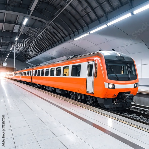 © Kurang, Fototapeta premium A bright orange train sits on the tracks inside a modern, spacious subway station with a curved ceiling