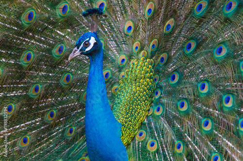 © Вячеслав Савин, Fototapeta premium A bright peacock walks along the grass and shows his beautiful plumage.