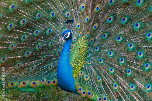 Fototapeta premium A bright peacock walks along the grass and shows his beautiful plumage.