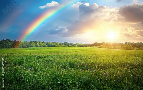 © Svitlana, Naklejka premium A bright rainbow appearing over a lush green field