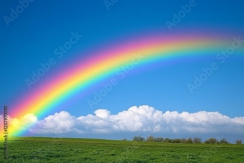 © adobestocker1, Obraz premium A bright rainbow over a field for World Environment Day, with clear blue skies