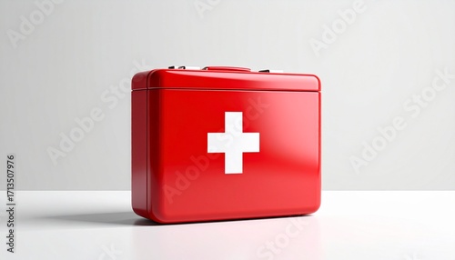 © Ai_Stock, Obraz premium A bright red first aid kit with a white cross symbol sitting on a clean white surface against a light background.