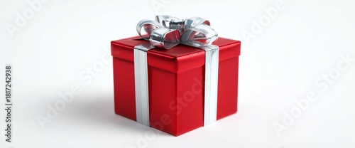 © Vitalii Shkurko, Obraz premium A bright red gift box with a shiny silver bow is placed on a smooth white surface. This festive decoration adds a cheerful touch for birthdays or holidays