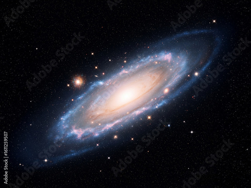 Naklejka premium A bright spiral galaxy with a luminous yellow core and blue arms, set against...