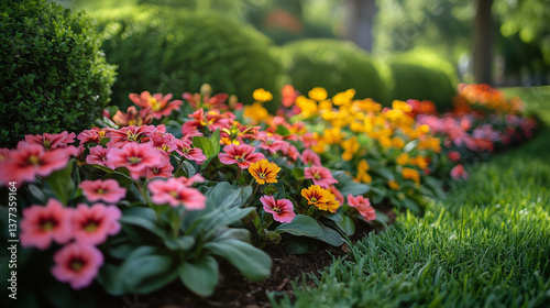 © Iuliia, Fototapeta premium A bright spring day with a sunny flowerbed filled with flowers of various colors.