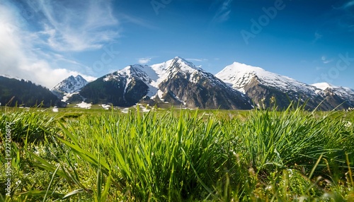 Fototapeta premium a bright spring scene with lush, fresh green grass in the foreground....