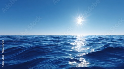 Obraz premium A bright sun glints on blue ocean water under a clear sky, creating a serene,...