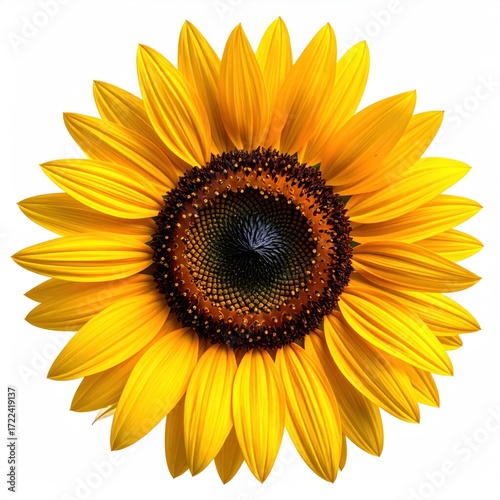 © LuxeLiving, Fototapeta premium A bright sunflower with vibrant yellow petals and a dark brown center, isolated against a white background, showcasing its natural beauty