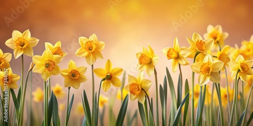 © lapeepon, Fototapeta premium A bright yellow daffodil field with tall stems swaying gently in the breeze, set against a soft pinkish-brown background