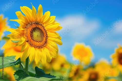 Fototapeta premium A bright yellow field of sunflowers against a clear blue sky, ideal for use in agricultural or nature-themed projects
