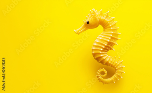 Fototapeta premium A bright yellow seahorse with an elegant curled tail isolated against a vivid yellow background.
