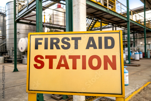 Obraz premium A bright yellow sign labeled "First Aid Station" situated in an industrial...