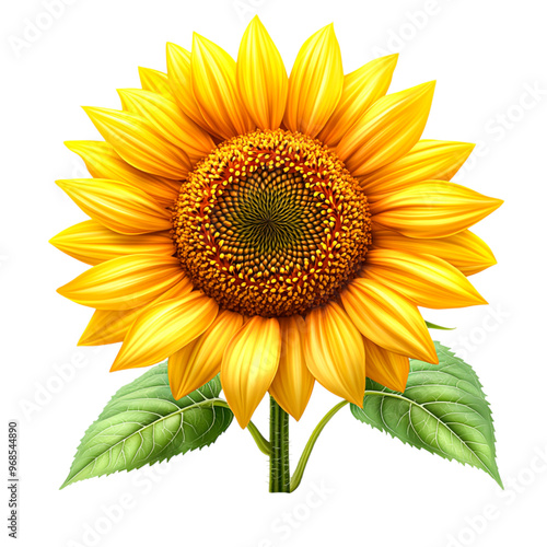 Obraz premium A bright yellow sunflower with green leaves isolated on a white background