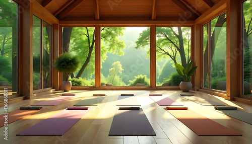 Obraz premium A bright yoga studio with wooden floors, floor-to-ceiling windows overlooking...
