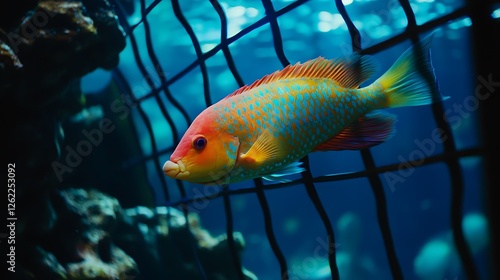 © Scott, Naklejka premium A brightly colored parrotfish swimming gracefully inside an aquarium-style cage, vivid hues glowing under blue light.