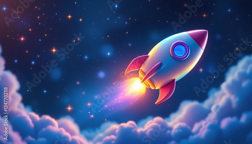 Naklejka premium A brightly colored rocket ship flying into the night sky above clouds