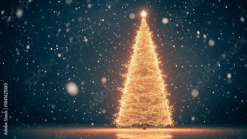 © Sujabat, Naklejka premium A brightly lit christmas tree stands tall amidst a gentle snowfall on a dark night