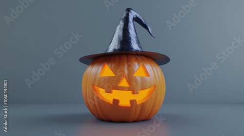 Fototapeta premium A brightly lit jack-o'-lantern wears a glossy black witch hat, casting an enigmatic glow amid a gently blue-tinged background, perfect for adding Halloween charm.