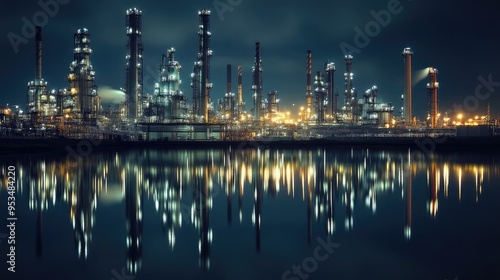 Naklejka premium A brightly lit oil refinery at night, reflecting in calm water, showcasing...