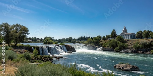 Fototapeta premium A brilliant blue sky above the waterfalls of Idaho Falls, blue sky, clear...