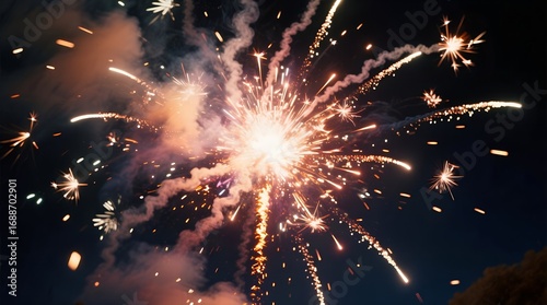 Fototapeta premium A brilliant firework explodes in a dazzling burst of golden light and sparks,...