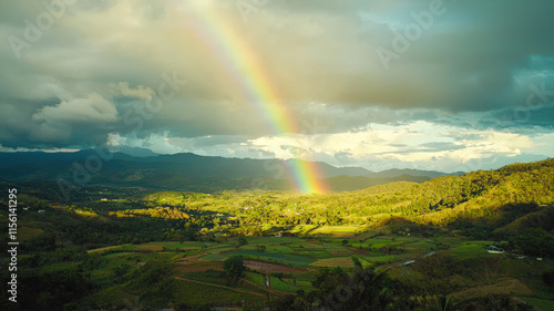 Obraz premium A brilliant rainbow arcs over a lush green valley, illuminated by sunlight...