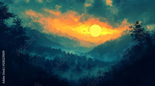 © Halfjoy, Fototapeta premium A brilliant sunset illuminates a mountainous forest landscape at dusk