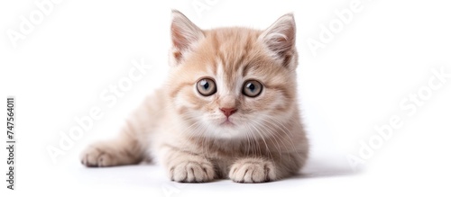 © AkuAku, Obraz premium A British kitten with striking blue eyes is captured in a moment of repose, laying down on a white background. The adorable felines fluffy fur and captivating gaze are sure to melt hearts.