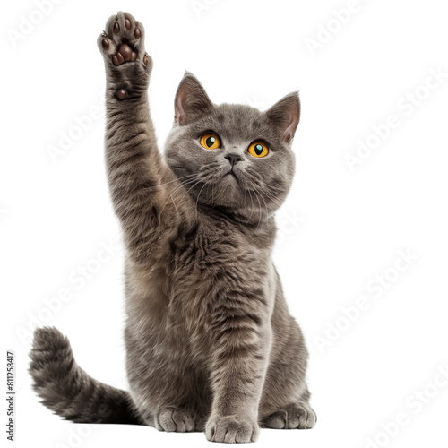Obraz premium A British Shorthair cat sitting and raising its paw to give high five,...