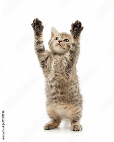 © Deea88, Obraz premium A British shorthair cat standing on two legs, holding up paws