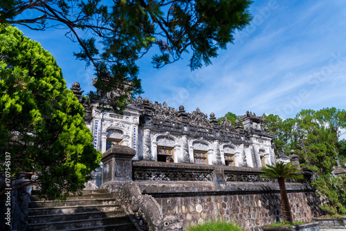 © Nhan, Fototapeta premium A broad view of the Khai Dinh Tomb's intricate, ornate exterior, with its detailed stone carvings and grand staircase under a striking blue sky.