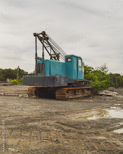 © creativica, Obraz premium a broken and rusty mobile crane from behind.