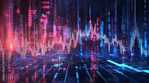 © 69 Timeless Studio , Obraz premium A broken profit forecast graph highlighted with neon cyber strokes on a futuristic business banner.