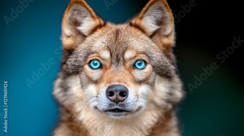 © Albert, Fototapeta premium a brown and black dog with blue eyes looking directly at the camera against a blurred background