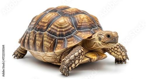 Naklejka premium A brown and tan tortoise with a patterned shell stands on a white surface...