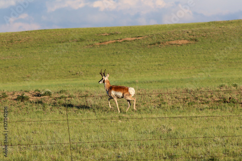 © GWells, Naklejka premium A brown and white antelope standing on top of a lush green field in Wyoming.