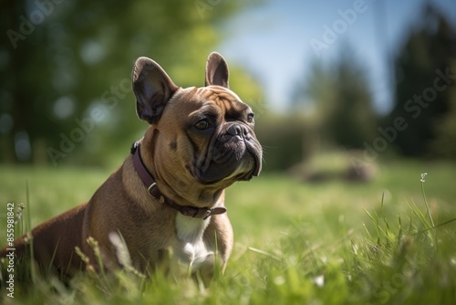 Fototapeta premium A brown and white dog is laying in the grass
