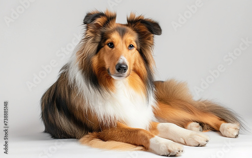 Fototapeta premium A brown and white dog is seen laying comfortably on top of a clean white floor