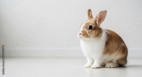 Fototapeta premium A brown and white rabbit sitting on a white floor.