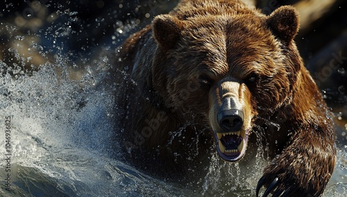 © hore, Fototapeta premium A brown bear charging at the camera, its sharp teeth and powerful claws visible as it
