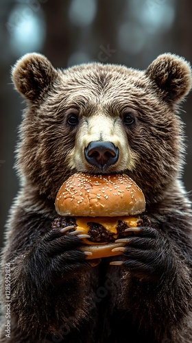 © Ardhana, Fototapeta premium A brown bear enjoying a delicious cheeseburger with sesame seeds