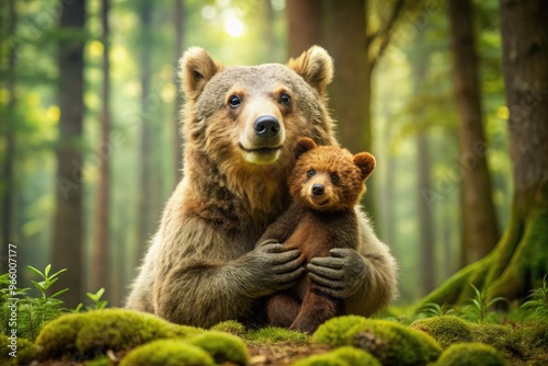 © Sirinporn, Fototapeta premium A Brown Bear With A Warm Smile Envelops A Wide-Eyed Squirrel In An Affectionate Embrace While Standing In A Lush Forest.